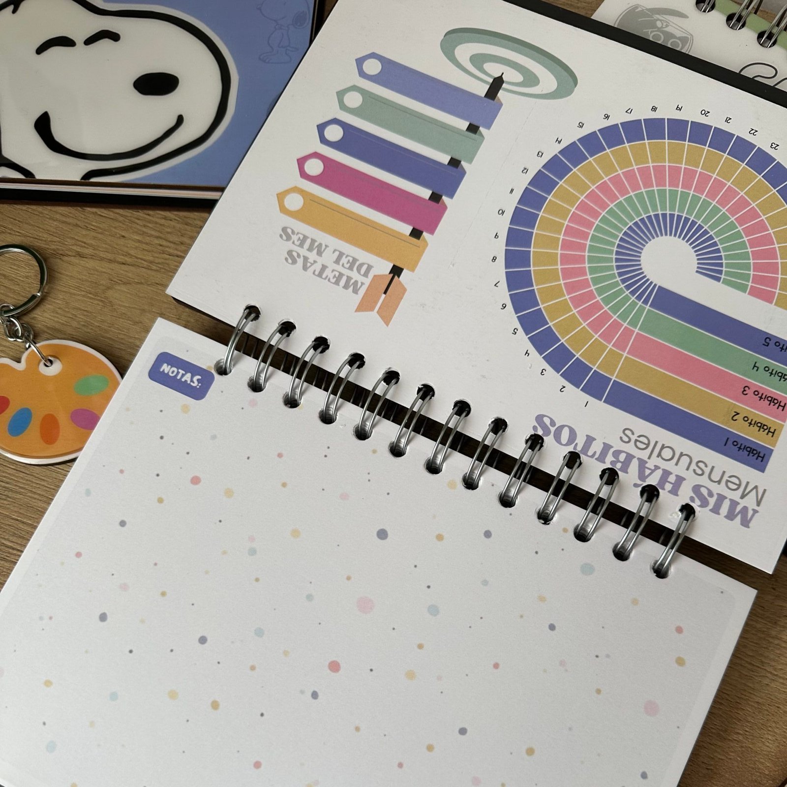 Incluye 12 hojas de notas mensuales y un Habit Tracker en la parte posterior de cada mes, ideal para registrar avances en proyectos, hábitos creativos o rutinas personales.