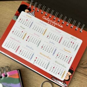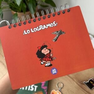 Fabricado en madera y resina, este calendario ofrece un acabado elegante y durable. Sus 26 hojas en propalcote destacan las ilustraciones clásicas de Mafalda en alta calidad.